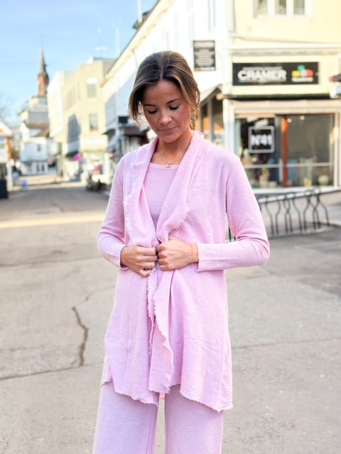 Dette er en åpen cardigan med en rysje-kant foran. Fin lengde.