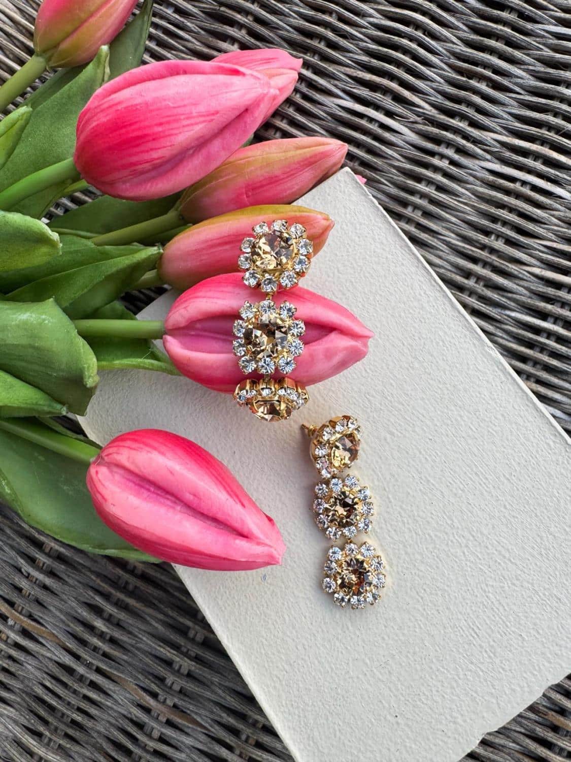 Supersøte øredobber med 3 stener hengende nedenfor hverandre.