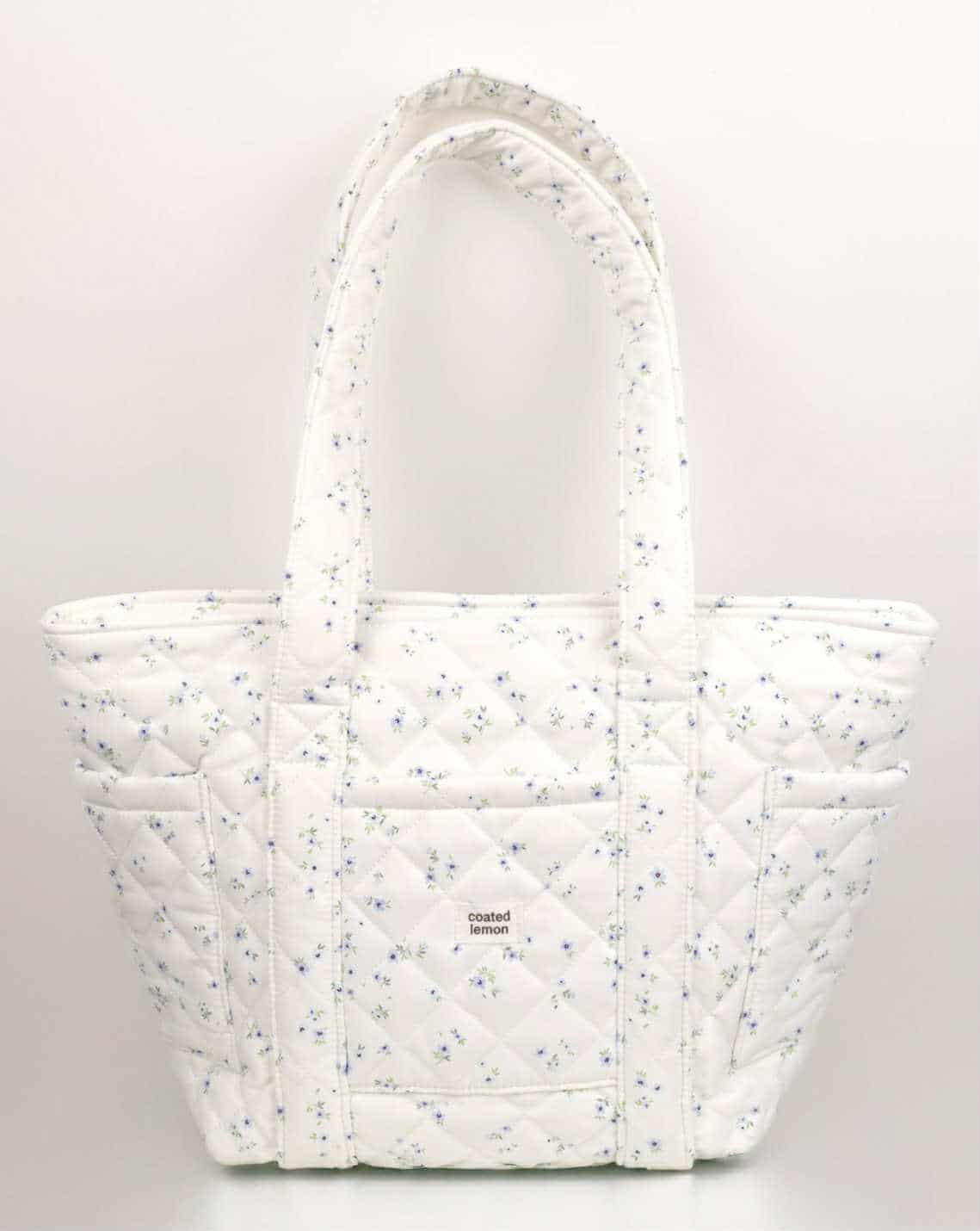Skulderveske i 100% bomull med blomsterprint, og striper i blå og grønn på innsiden. Tre praktiske lommer på forsiden og sidene av vesken, og tre på innsiden. Sømløst fôr, vattert med padding og solid glidelås.