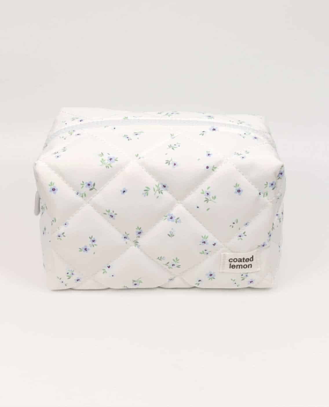 Toalettmappe i 100% bomull med blomsterprint, og striper i blå og grønn på innsiden. Stoffet på innsiden og utsiden av toalettmappen er vannavstøtende. Sømløst fôr, vattert med padding og solid glidelås.