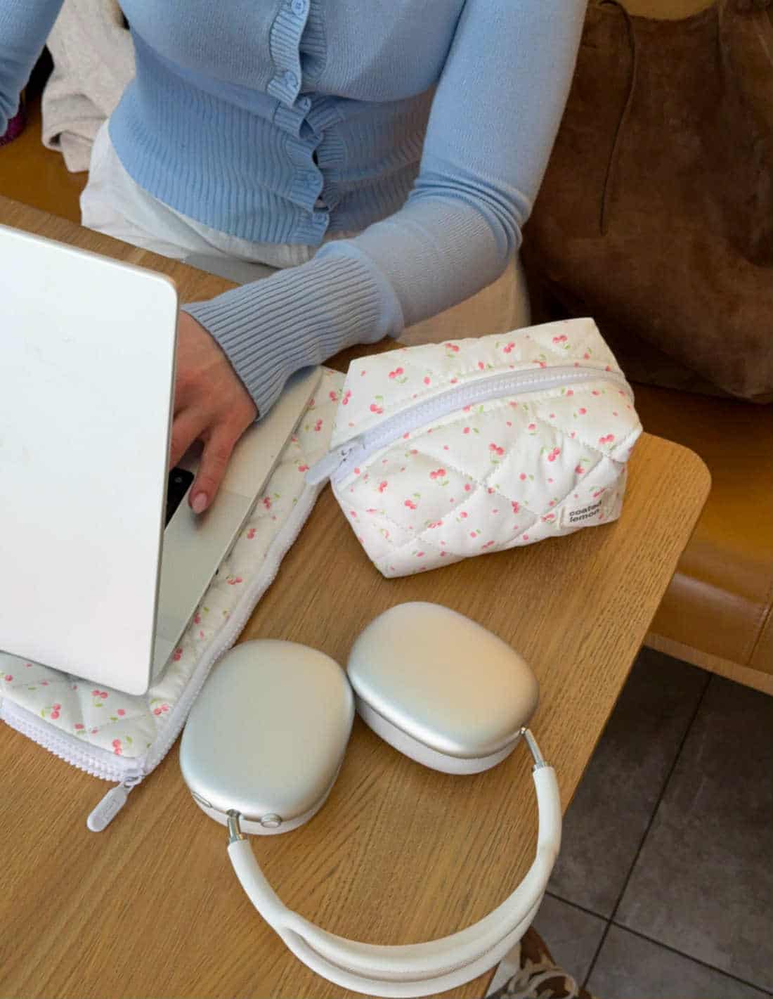 Toalettmappe i 100% bomull med cherry print og et rutete, rosa stoff på innsiden. Stoffet på innsiden og utsiden av toalettmappen er vannavstøtende. Sømløst fôr, vattert med padding og solid glidelås.