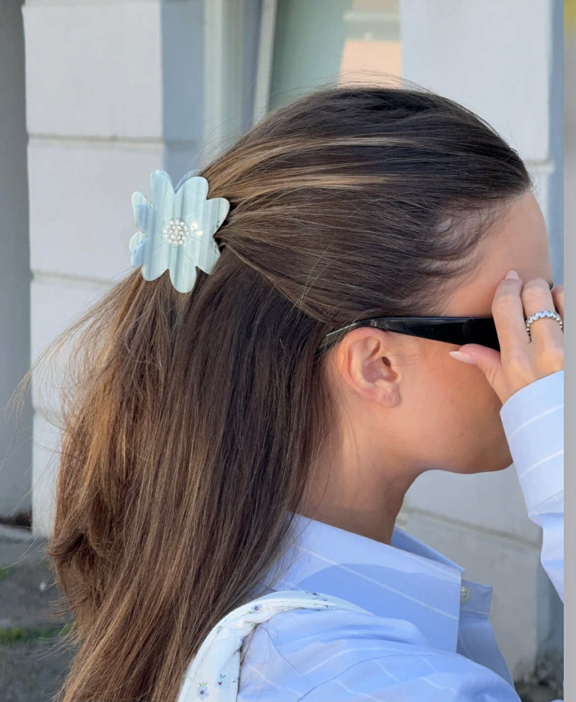 En blomsterformet hårklype med skinnende steiner. Både fin som dekor i en bun og sterk nok til å holde oppe hele håret.