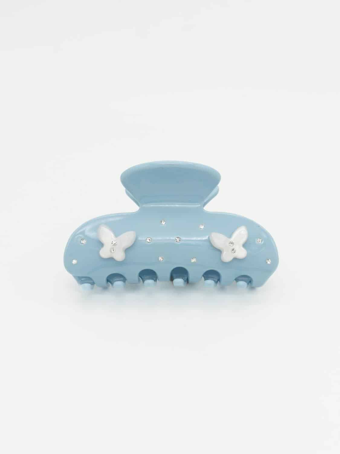 En mellomstor hårklype med hvite sommerfugler og skinnende steiner. Passer til en lav bun eller «half-up-half-down» frisyre.