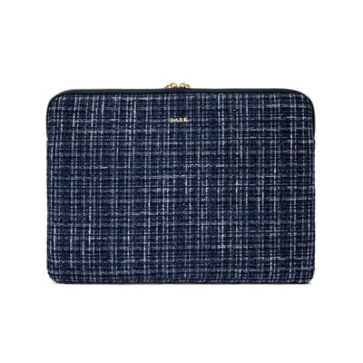 Tweed Mac Cover er en elegant og klassisk datamappe i vevd tekstil og lekker gullfarget glidelås. På fremsiden er det en liten diskret gullfarget Dark-logo. Mappen har ett hovedrom med plass til 13 tommers datamaskin, og en liten sidelomme inni.
