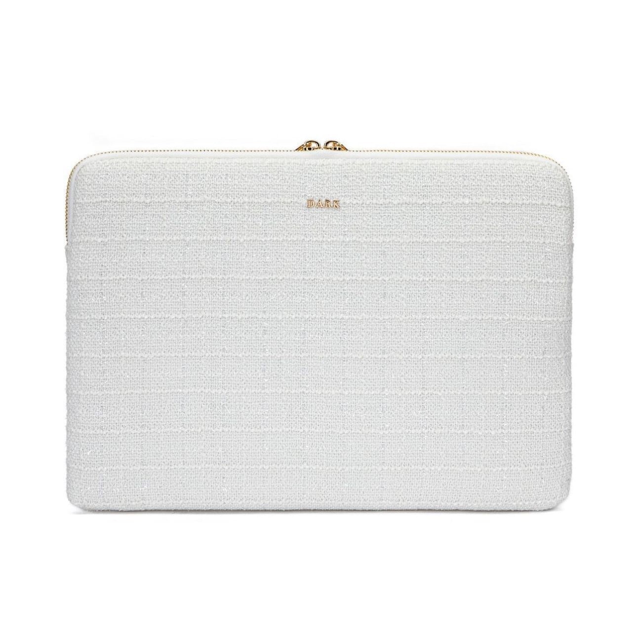 Tweed Mac Cover er en elegant og klassisk datamappe i vevd tekstil og lekker gullfarget glidelås. På fremsiden er det en liten diskret gullfarget Dark-logo. Mappen har ett hovedrom med plass til 13 tommers datamaskin, og en liten sidelomme inni.
