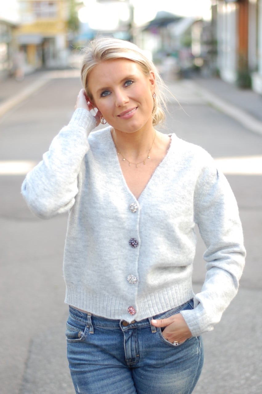 Anbefaler å trekke cardiganen over hodet, da «diamantene» som brukes som knapper kan være litt vrien å få åpnet ( men det går, må bare være litt ekstra forsiktig)