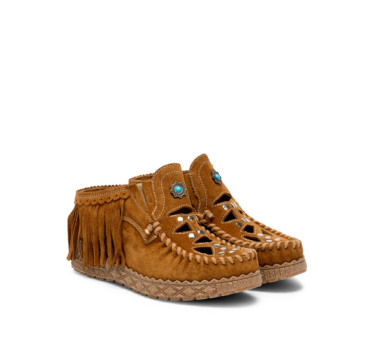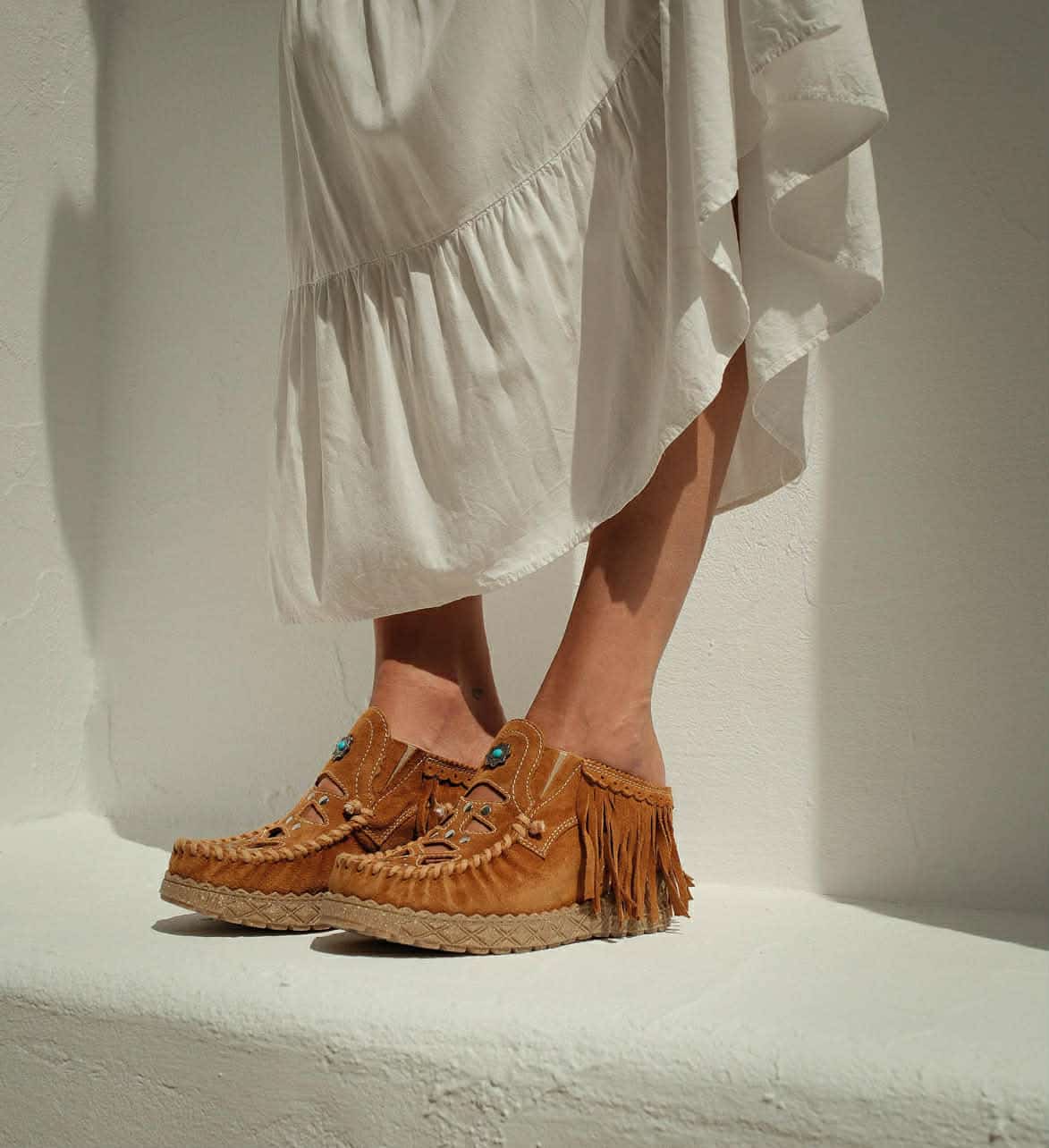 Bella er den nye mokkasinskoen fra El Vaquero, som kombinerer hverdagskomfort med autentisk håndverksstil. Med utskjæringer på oversiden, frynset bakside og håndsydde sømmer, tilbyr den en myk fotseng og en gummisåle for et sofistikert, bohemsk utseende. Laget av semsket kalveskinn med vintagefinish, forsterket av den anerkjente Silverstone-vasken. Hvert skinn er unikt, med intense farger og et innslitt utseende som forteller en historie.