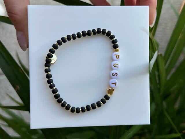 Armbåndet er håndlaget med strikk og perler.