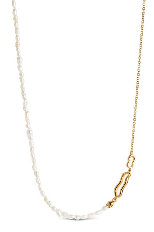 «Juliana Necklace» fra Enamel Copenhagen. Lekkert halskjede i forgylt sterlingsølv dekorert med små hvite perler. Grønn emaljekule ved låsen. Regulerbart.