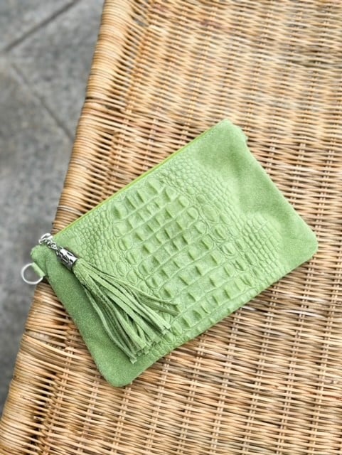 Glidelås med dusk og det følger med en skinnreim som er justerbar.