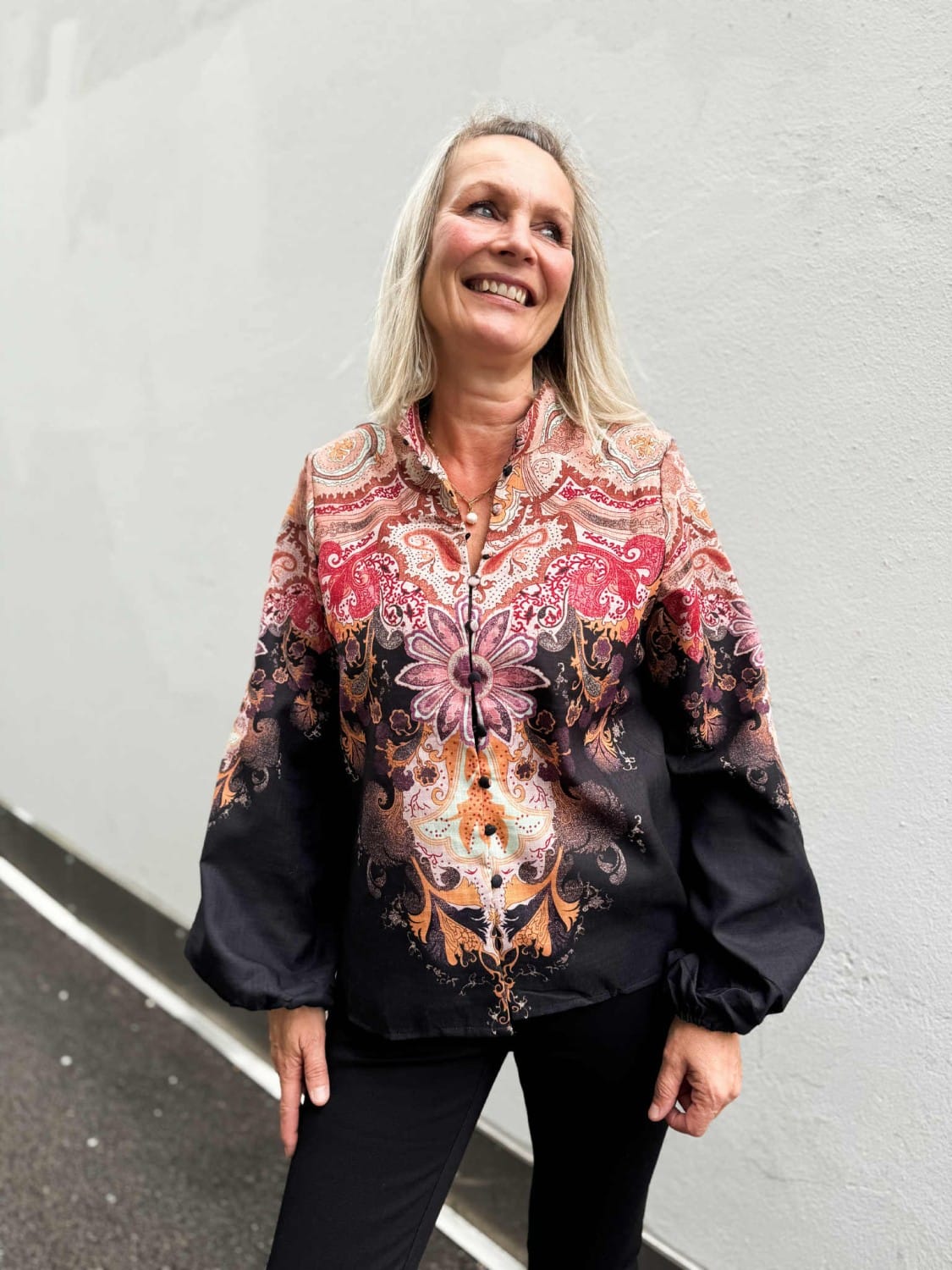 Se så fin bluse! Lekre farger og print med knepping i front og volumiøse ermer med strikk nederst.
