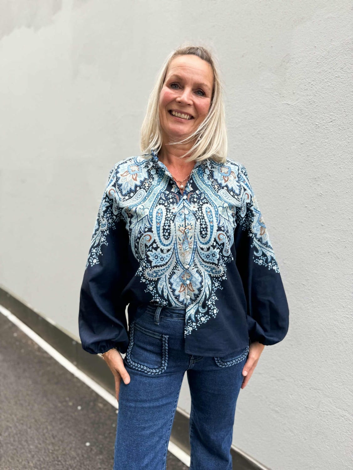 Se så fin bluse! Lekre farger og print med knepping i front og volumiøse ermer med strikk nederst.