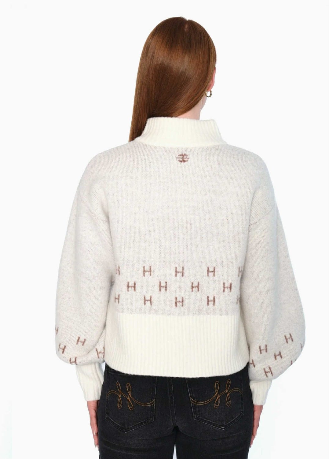 Utforsk vår korte strikkejakke med glidelås, høye ribber på ermene og nederst, og elegante H-logoer strikket inn i designet.