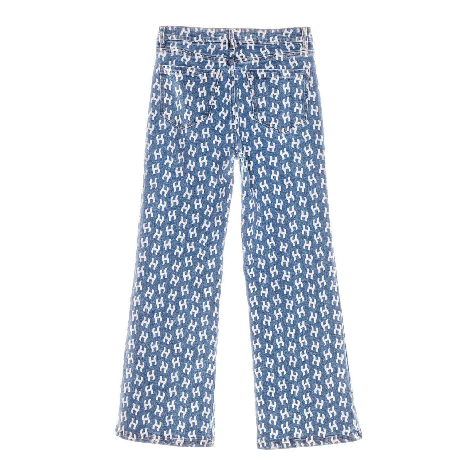 Tøff bukse fra det norske merke Hèst. Dekortert med H`er . Har forlommer og baklommer. Modellen er høy på livet og vide bein.