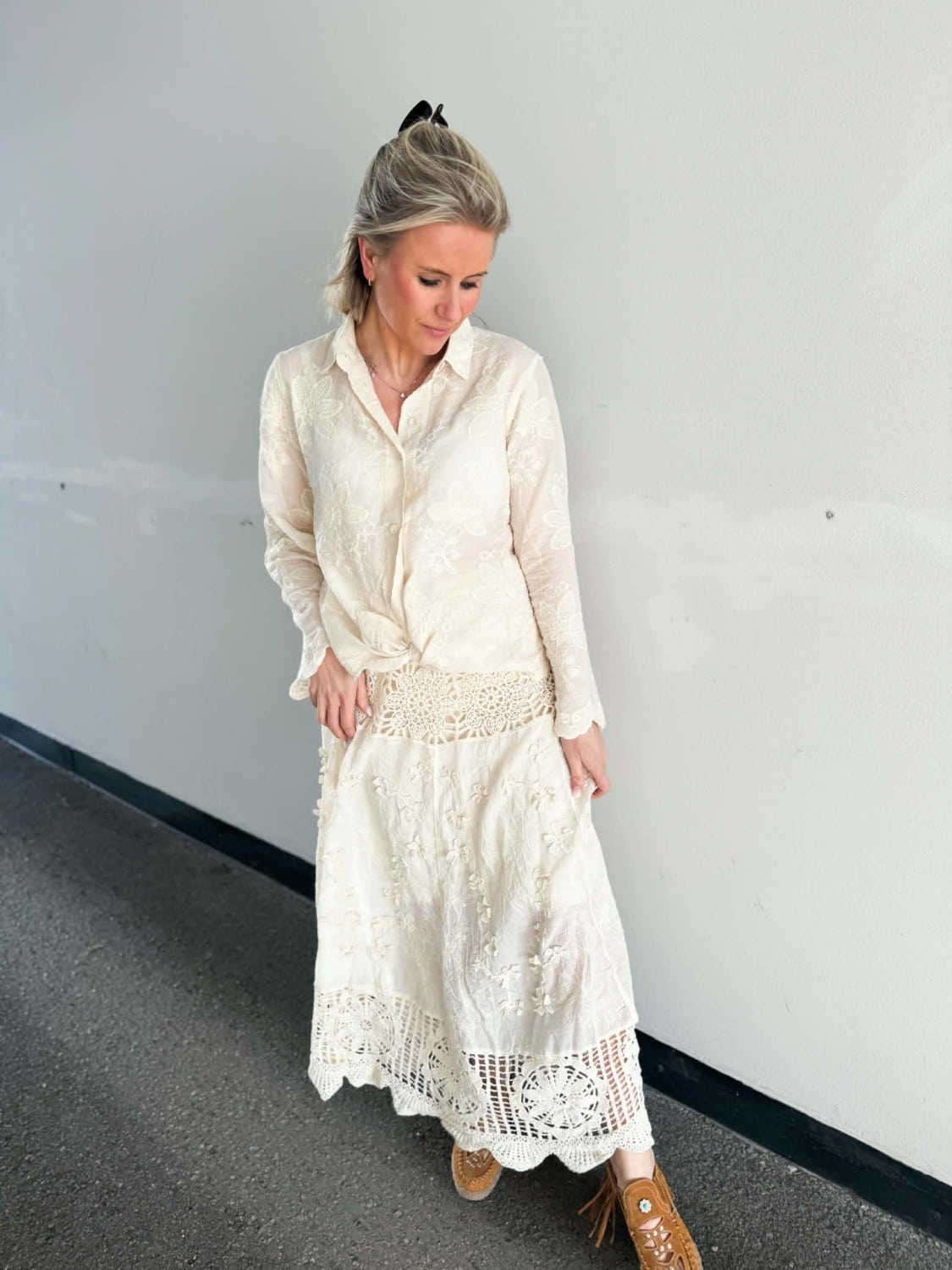 Nydelig boho skjørt med lekre detaljer. Skjørtet har strikk i livet.