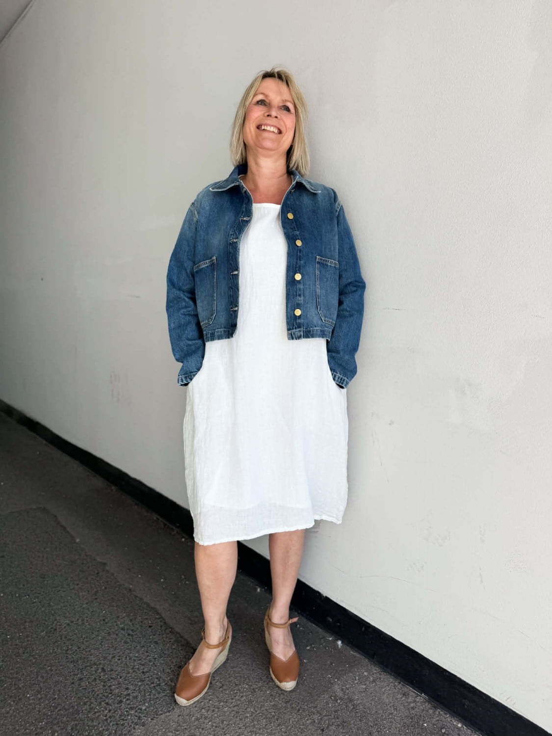 Modellen på bildet er 168 cm høy og er normalt en størrelse medium.