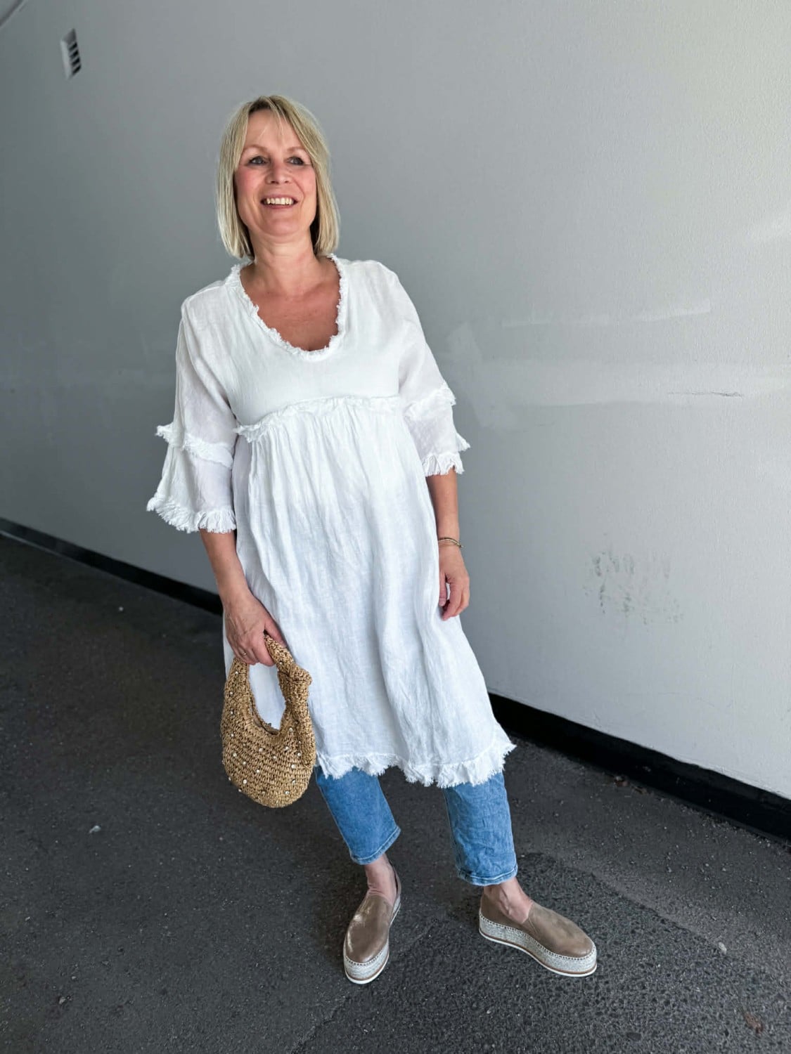 Modellen på bildet er 168 cm høy og er normalt en størrelse medium.