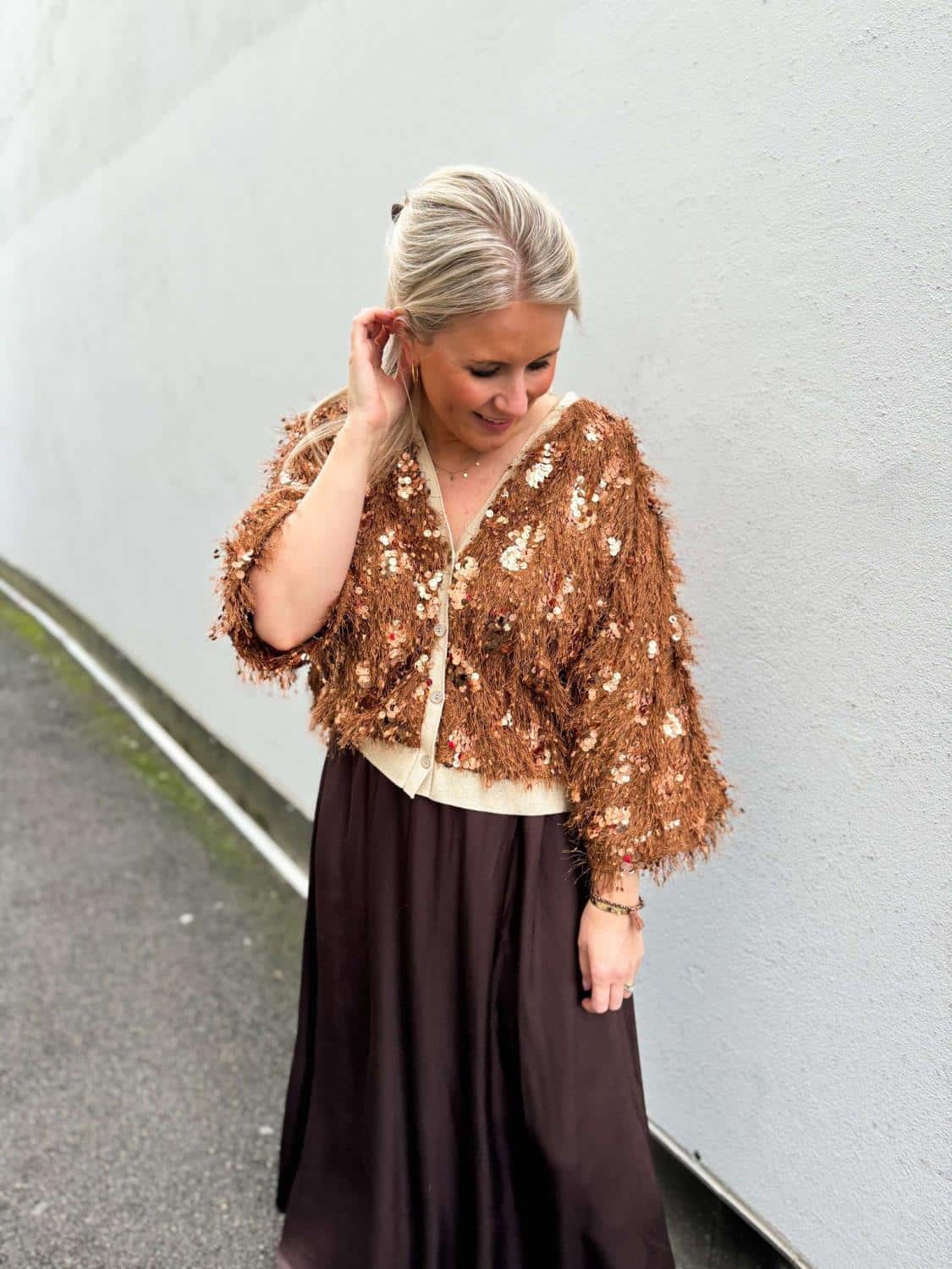 Luna Gold Jacket er en lekker jakke / cardigan du kan bruke både til et skjørt, svarte bukser eller en jeans.