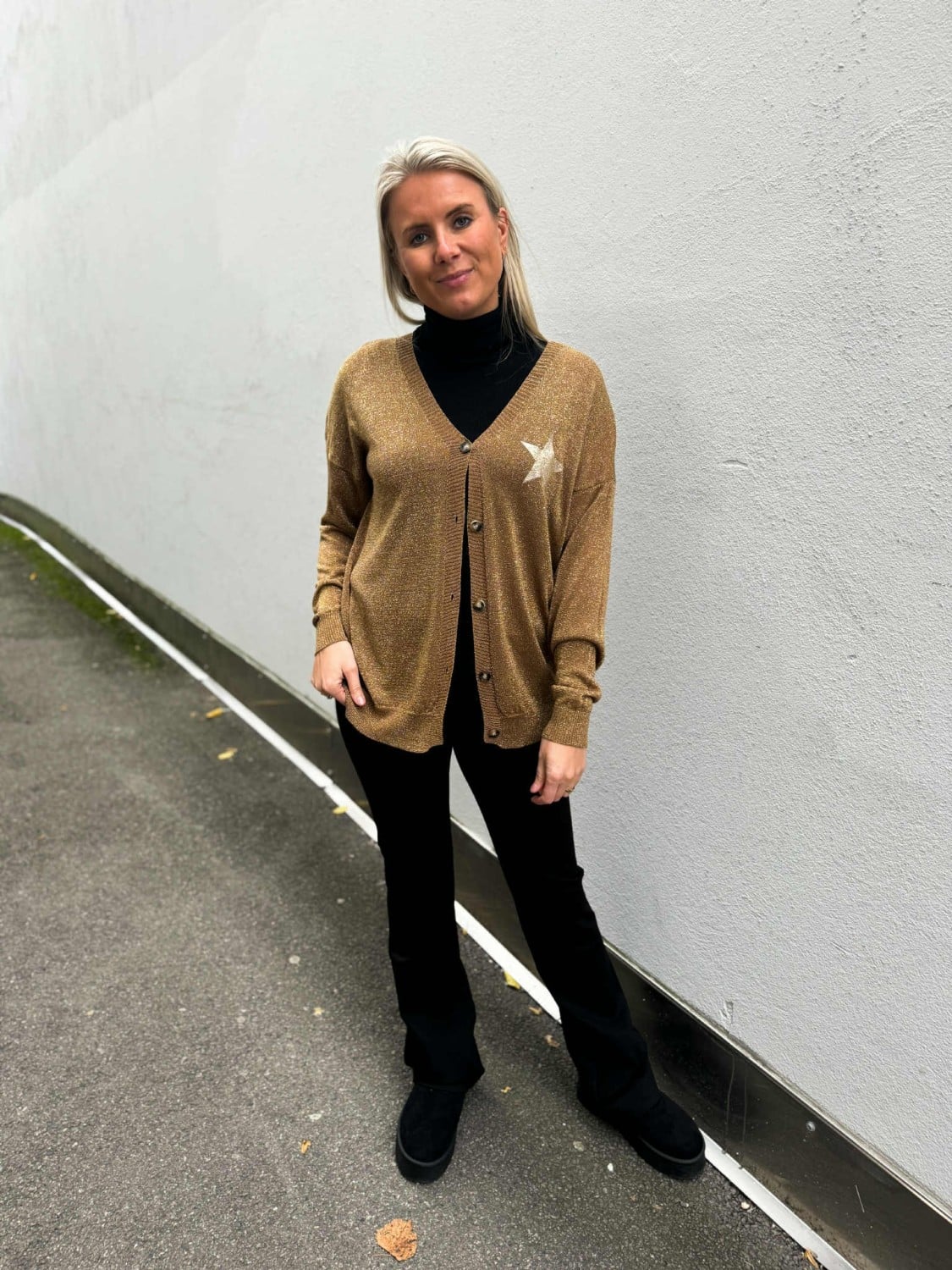 Unik og fin cardigan med knepping og i gull-lurex tråder. Kvaliteten er i en viskose blanding.
