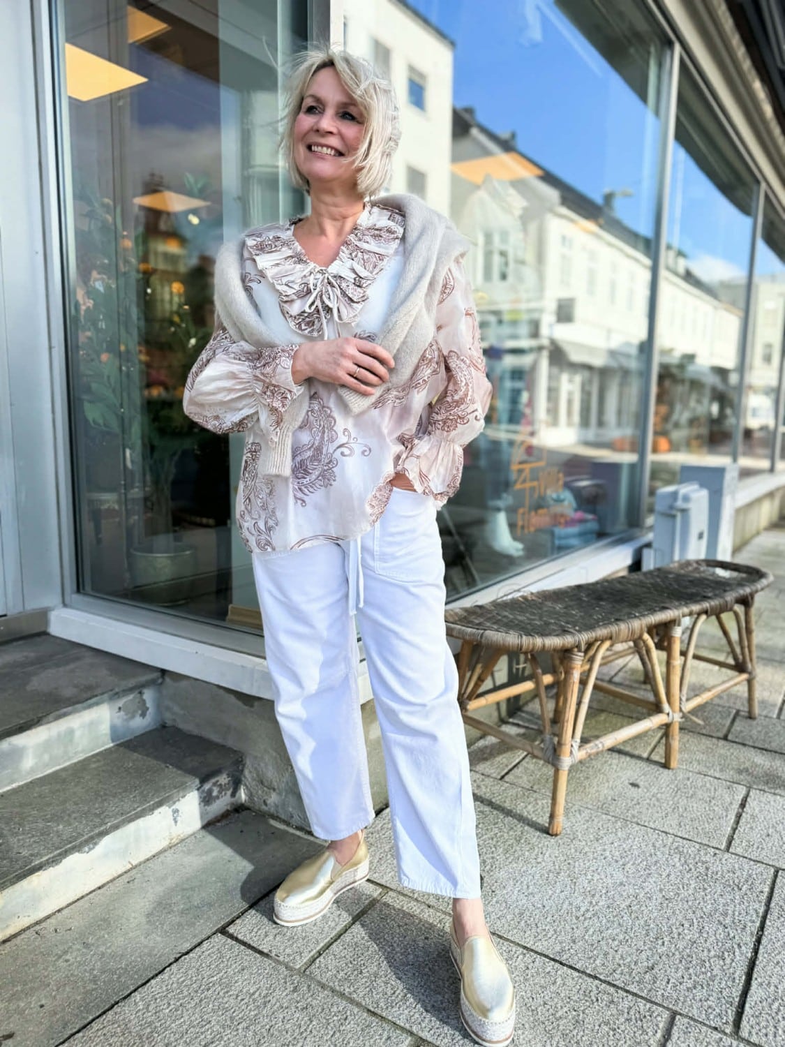 Delikat print og detaljer. Strikk nederst ved ermene – slik at blusen kan trekkes opp hvis man ønsker.