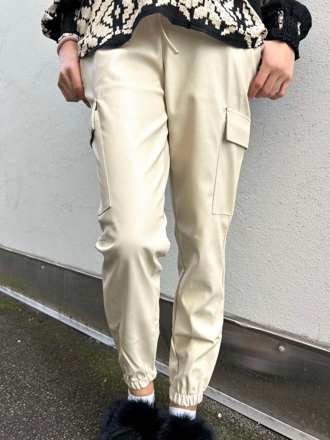 Tøff skinnbukse i en Off White farge. Buksen har strikk nederst ved beinene og har knytning i livet. Lommer på siden og nede ved leggen.