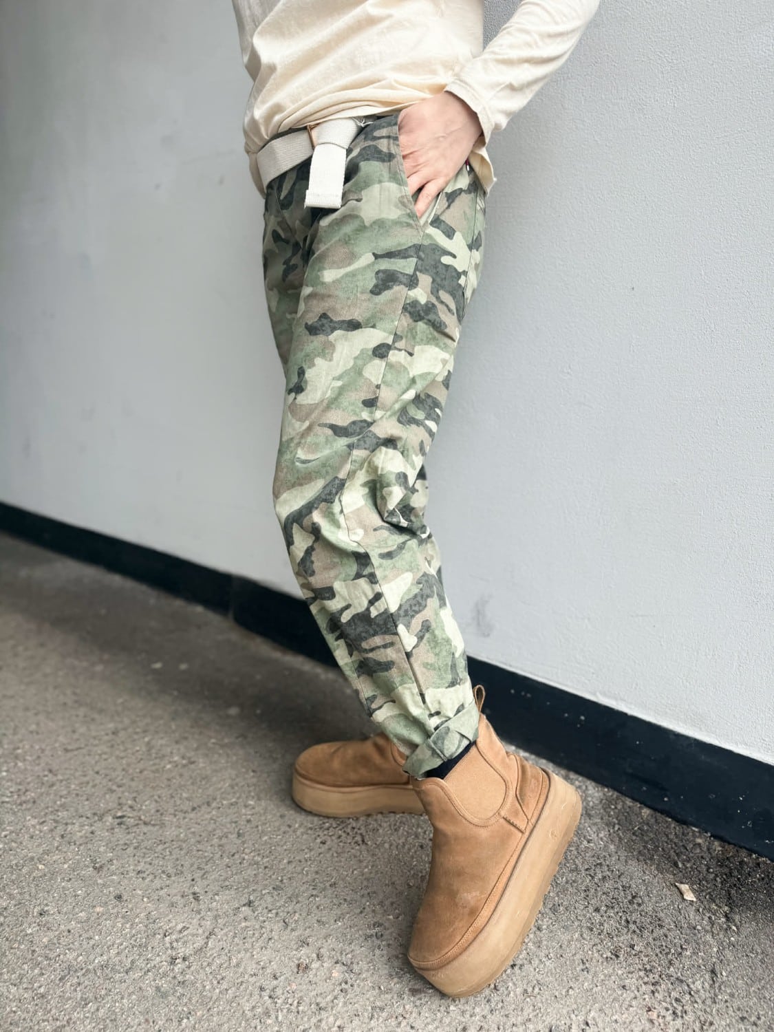 Stilig bukse med army print, strikk i livet, lommer og belte.