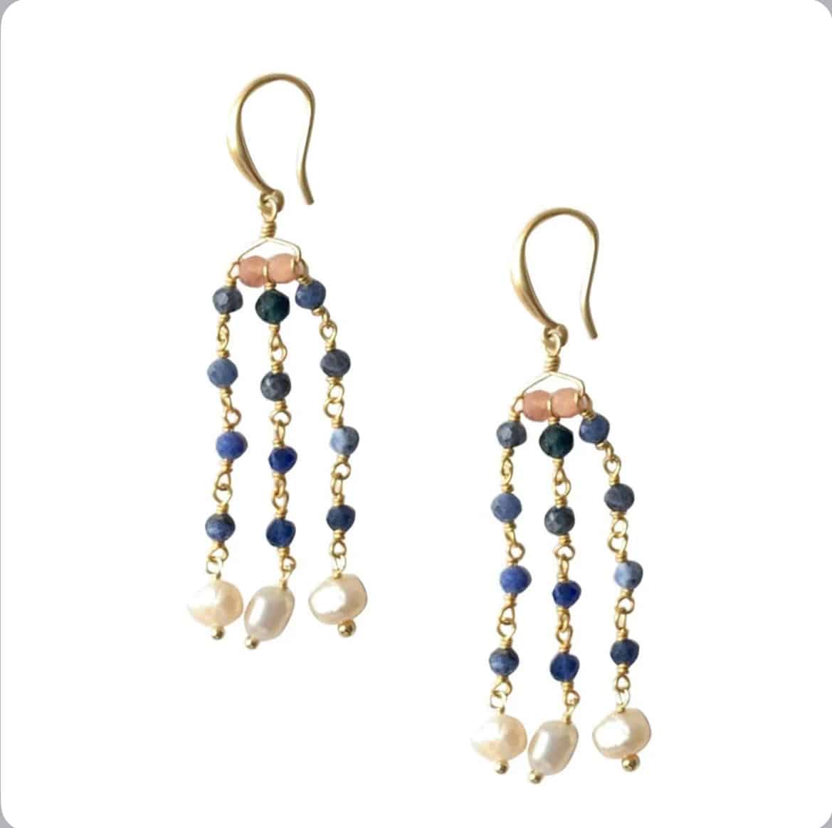 Gullbelagte perletråd med ferskvannsperler og blå stener.