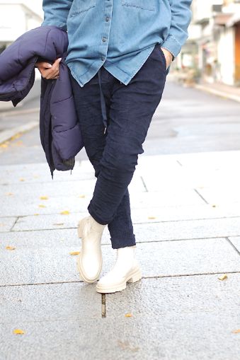 Strikk i livet med snøring og lommer.
