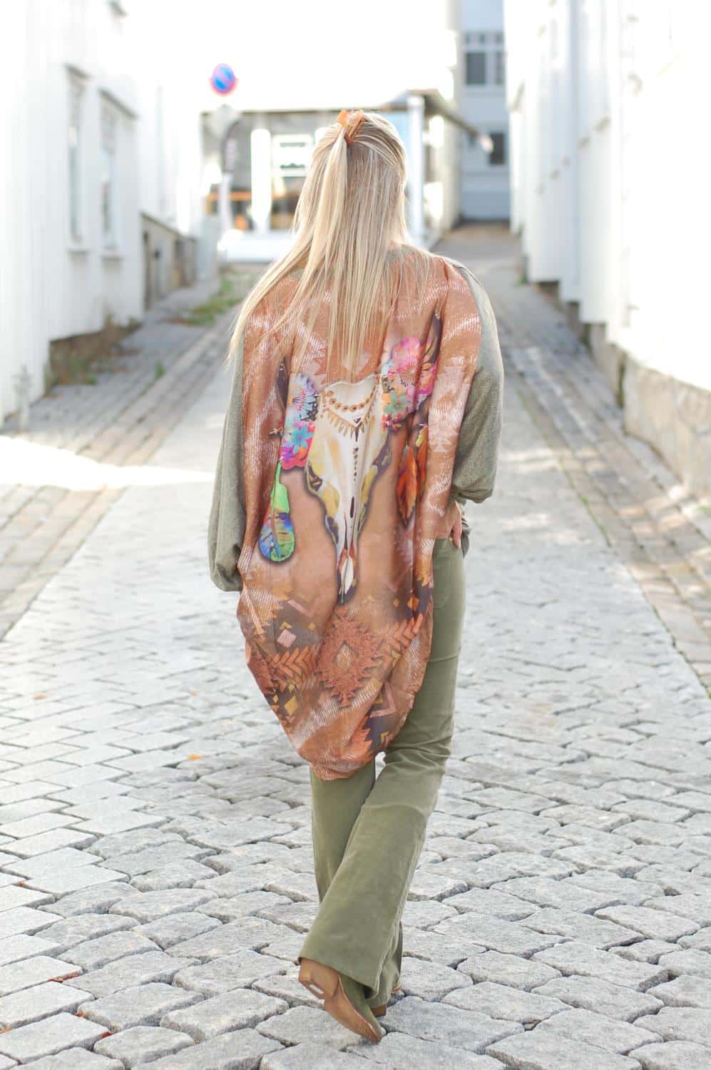 Kan brukes som en bluse, skjorte eller åpen jakke. Blusen er lengre bak enn foran.
