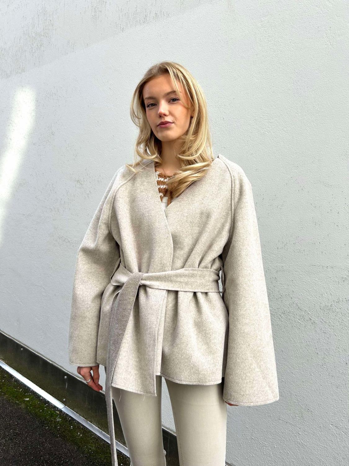 Superfin Beigemelert omslagsjakke med stikklommer i siden.