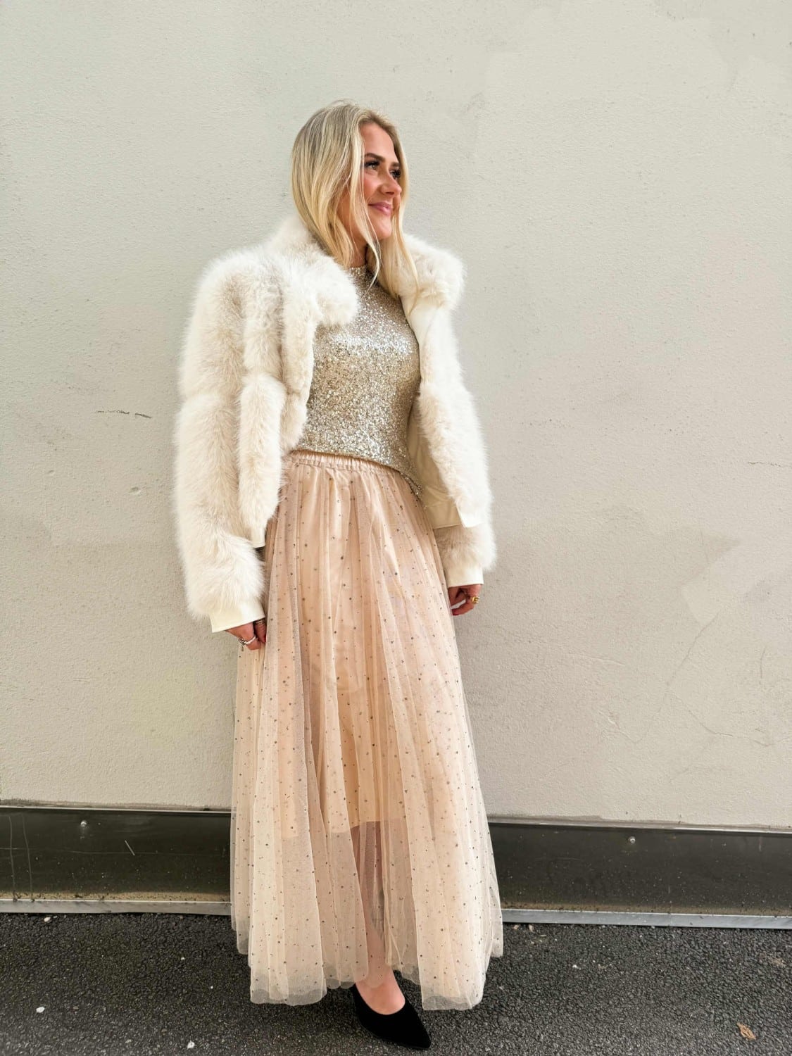 Sjekk det lekre tyllskjørtet med små stener i. Dette skjørtet får det virkelig til å skinne.