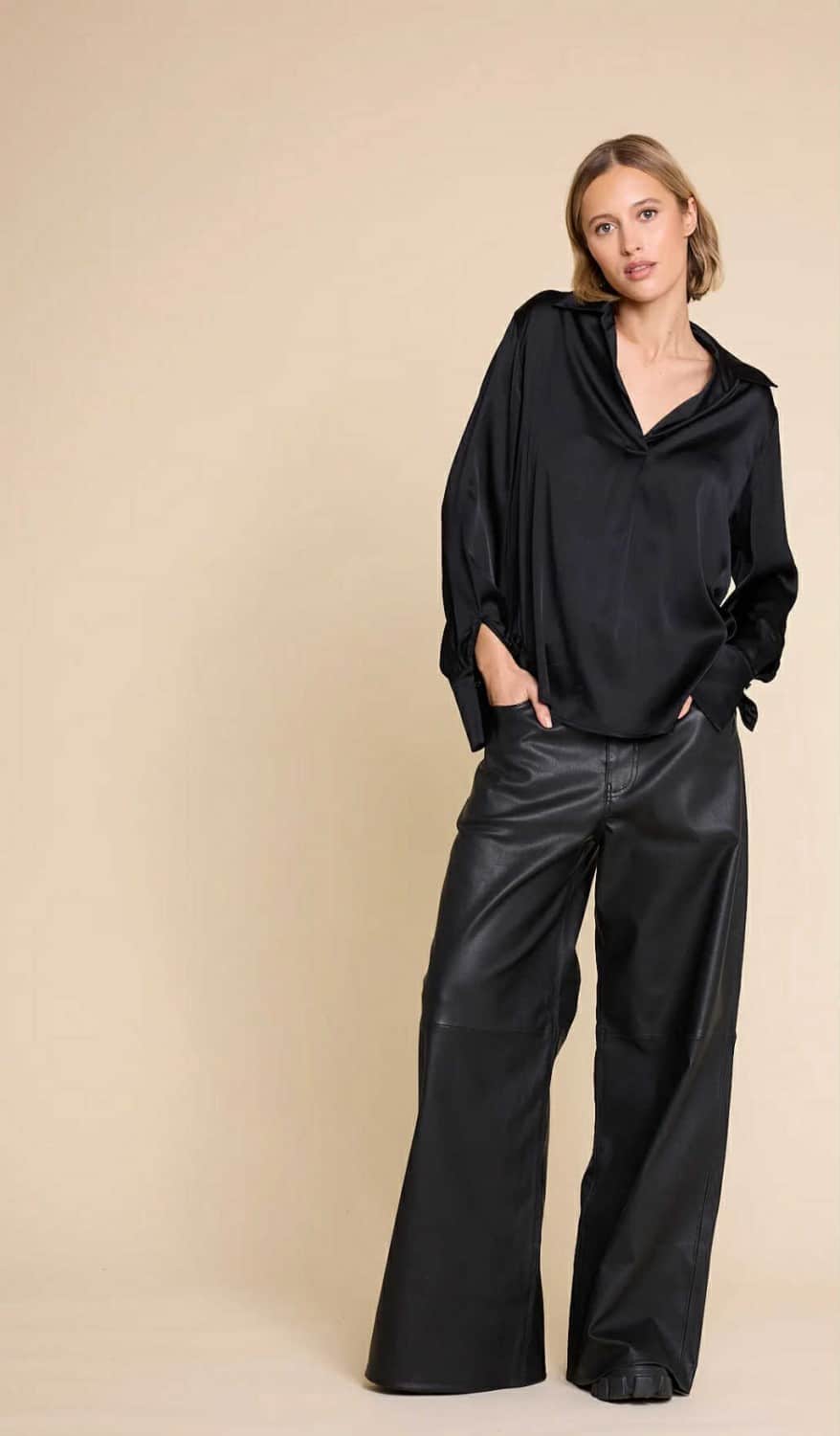 Denne skjorten er perfekt til både hverdag og fest! Glatt og fin kvalitet, faller fint og har brede mansjetter nederst på ermene som får blusen til å ekstra eksklusiv ut.