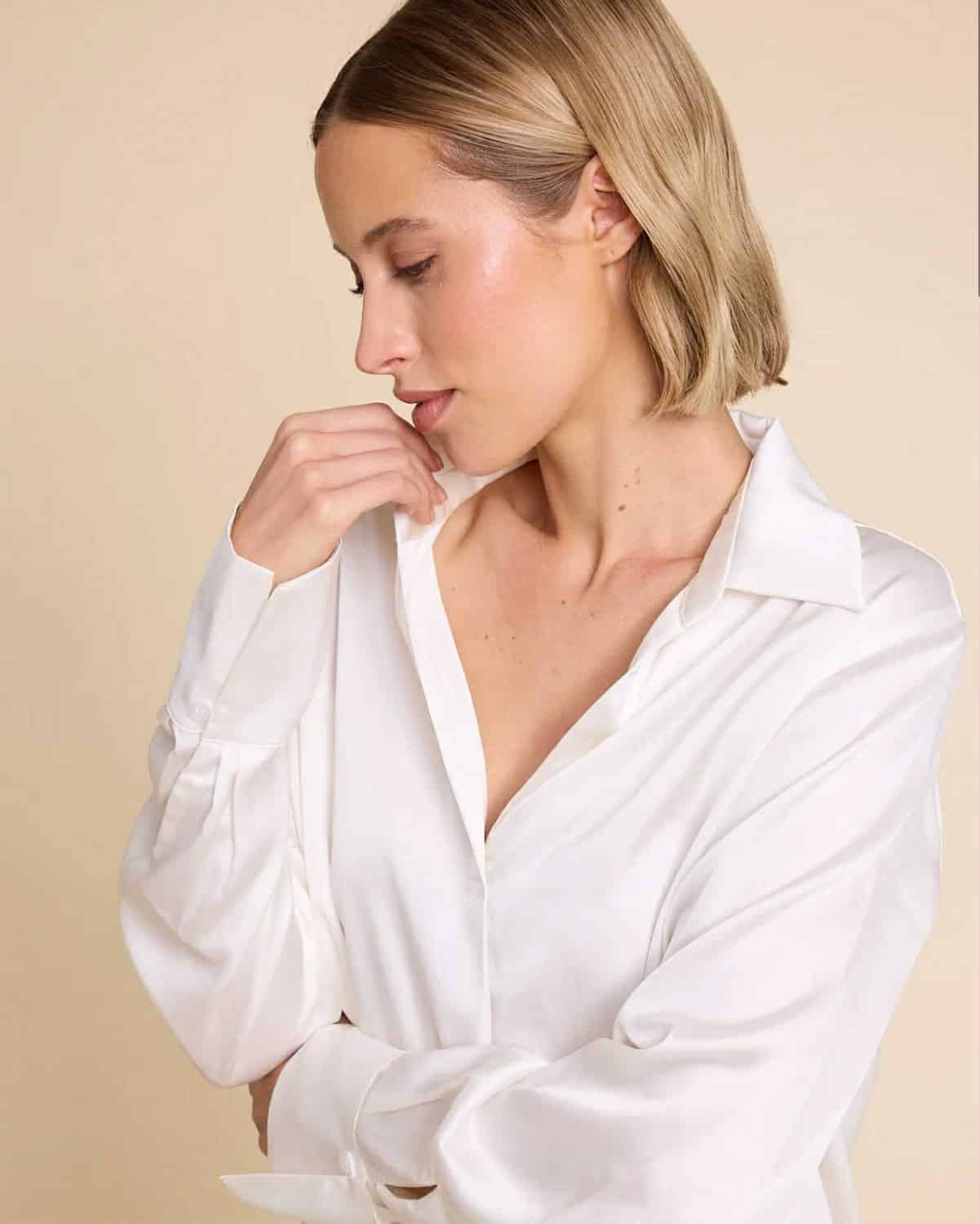 Denne skjorten er perfekt til både hverdag og fest! Glatt og fin kvalitet, faller fint og har brede mansjetter nederst på ermene som får blusen til å ekstra eksklusiv ut.