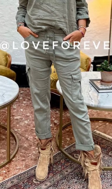 Nydelig tencel/bomull kvalitet. Strikk i livet, knyting og lommer,
