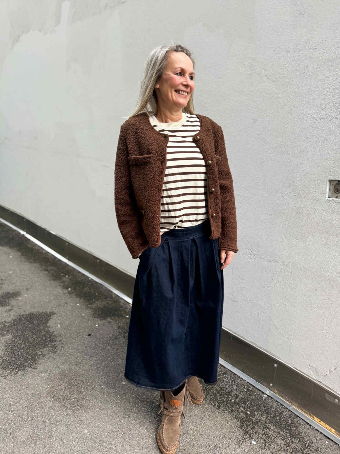 Aila skjørt er et tøft skjørt i en mørk denim kvalitet. Strikk i livet og lommer.