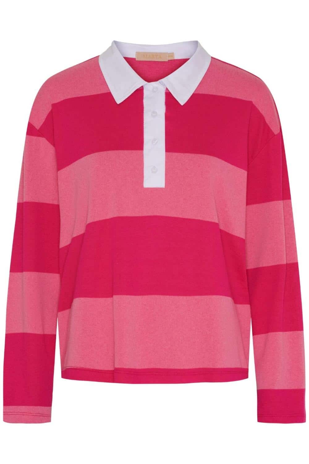 Fin polo fra Marta Du Chateau med striper i rosa farger. Genseren har en hvit krage og kan kneppes opp i halsen om man ønsker.