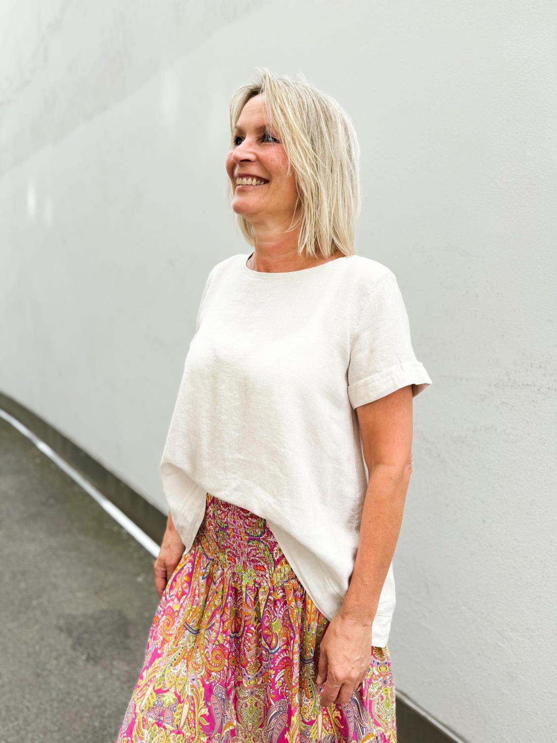 T-Skjorten er lengre bak enn foran og med rund hals.