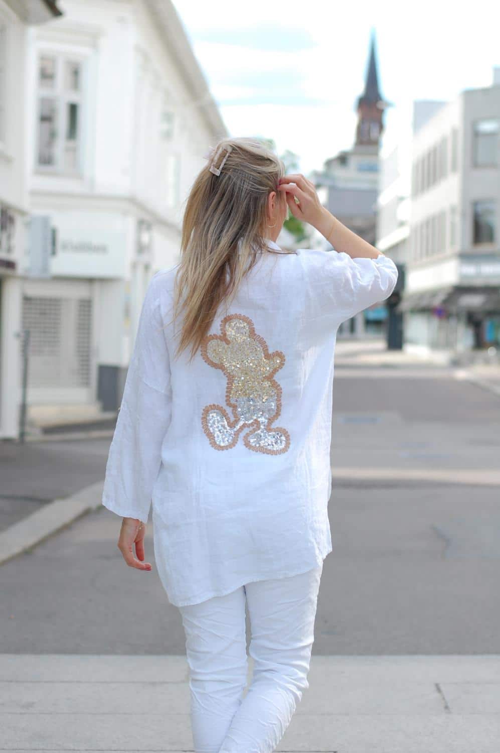 Linskjorte med Mikke Mus på ryggen i paljetter.