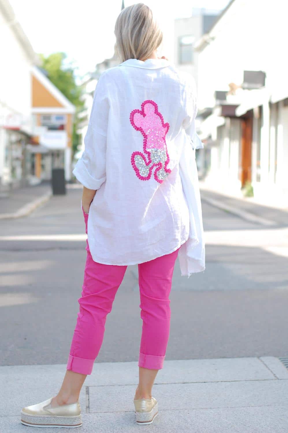 Linskjorte med Mikke Mus på ryggen i paljetter.