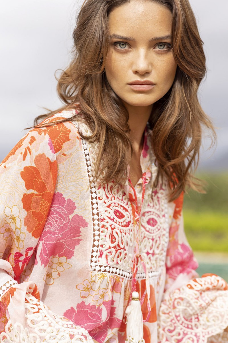 This romantic Grazia blouse features flared sleeves with delicate lace trim. With its small V-neckline punctuated by ties, it has everything to please. Wear yours with shorts or your favorite jeans for a casual look combined with a pair of wedge sandals.