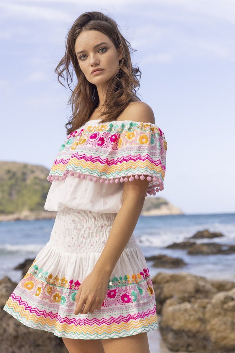 We adopt without hesitation the mini skirt MIKI smocked at the waist, hyper trend this season! Its embroidery and its slightly trapezoid cut make this model a key piece to adopt urgently! This piece goes perfectly with our Zuma top.