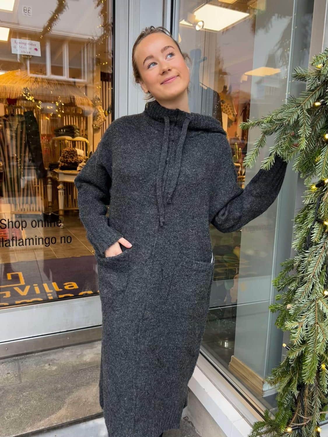 Behagelig kjole i deilig og myk kvalitet. Hetten har gjennomgående snøring. 2 dype front lommer. Svak ribbekant på ermer og nederst på kjolen. Er i en OneSize. Passer fra en 36- 44.