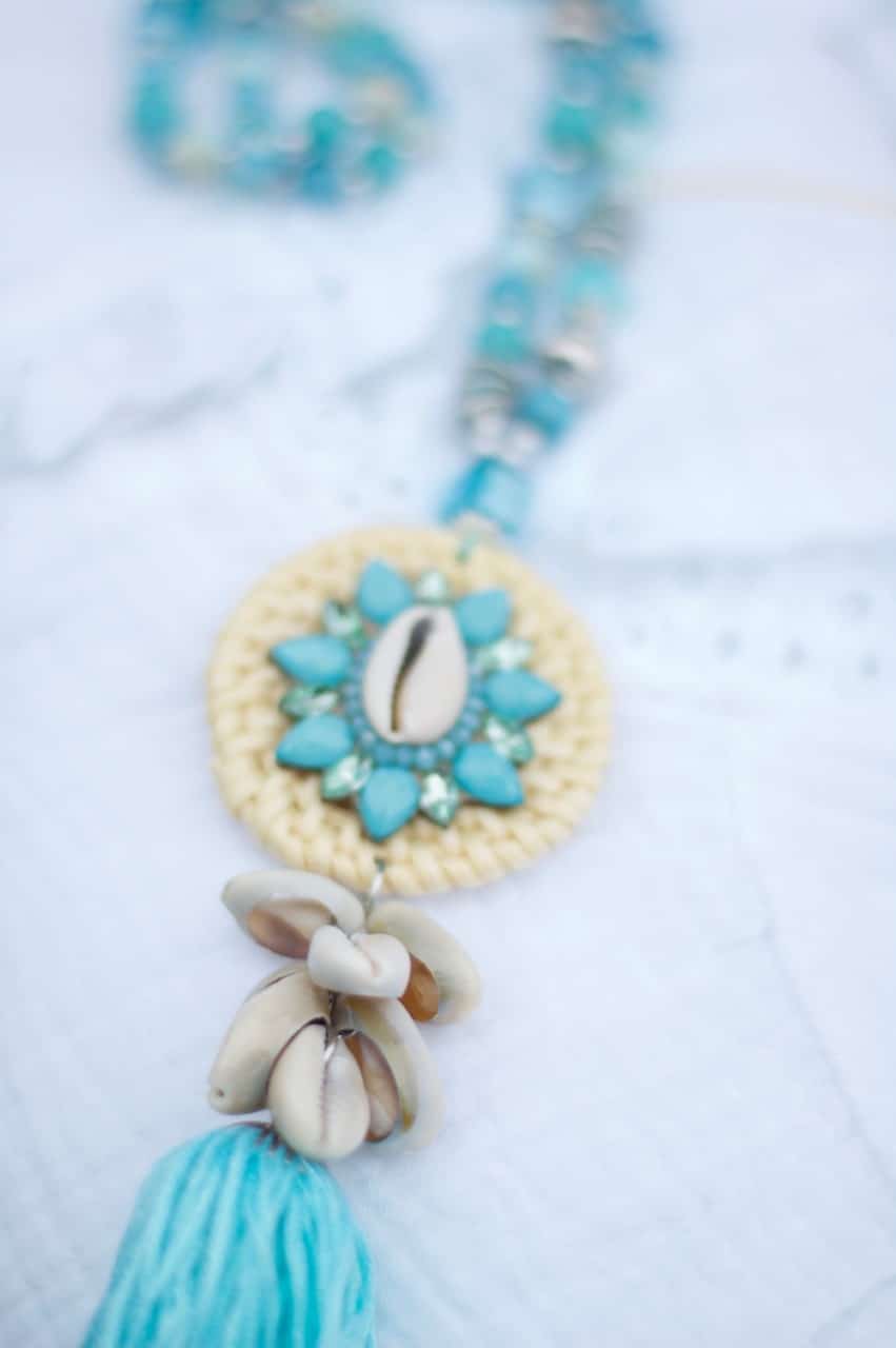 Nydelig smykke med lekre detaljer, skjell og dusk.