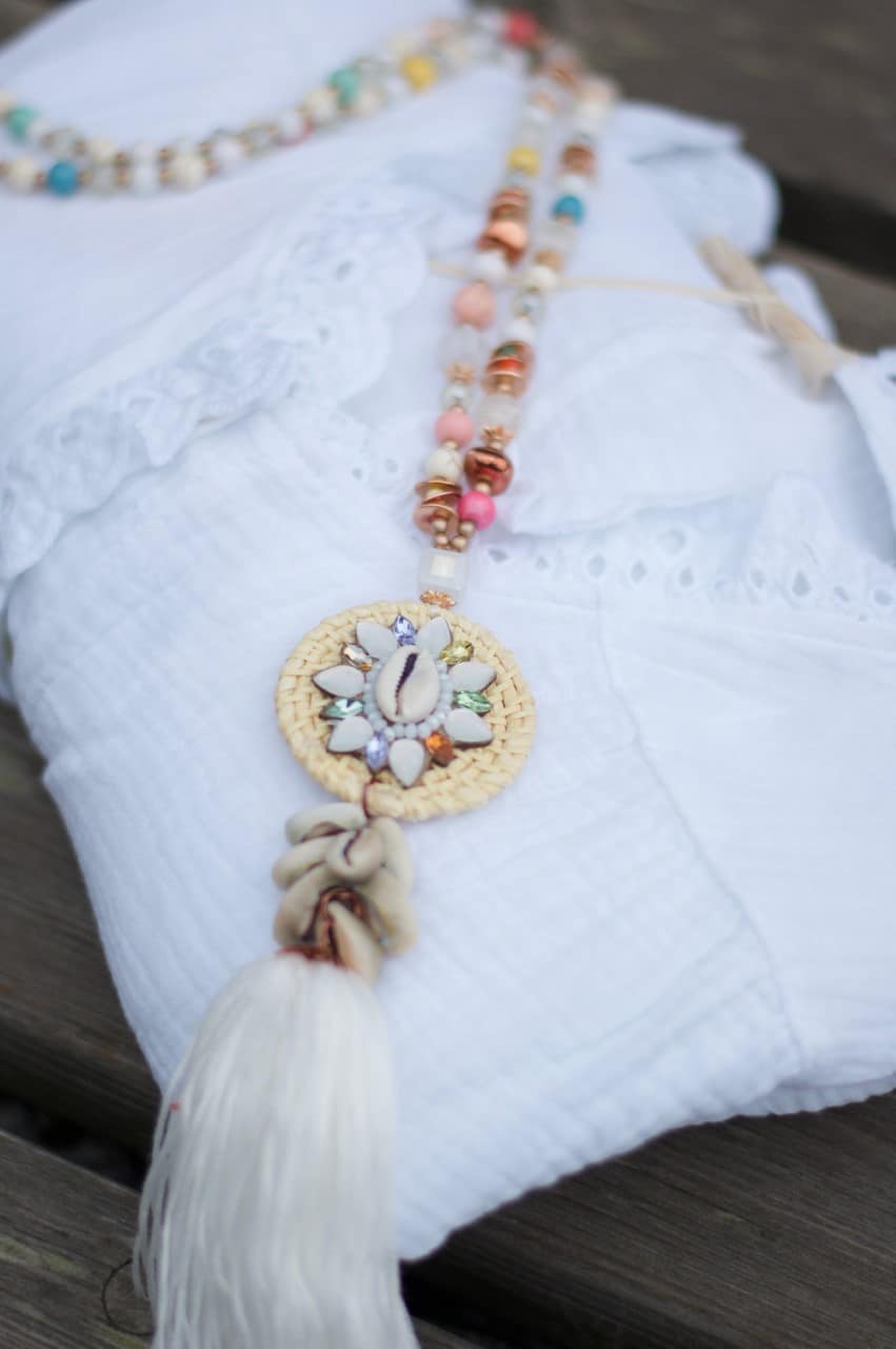 Nydelig smykke med lekre detaljer, skjell og dusk.