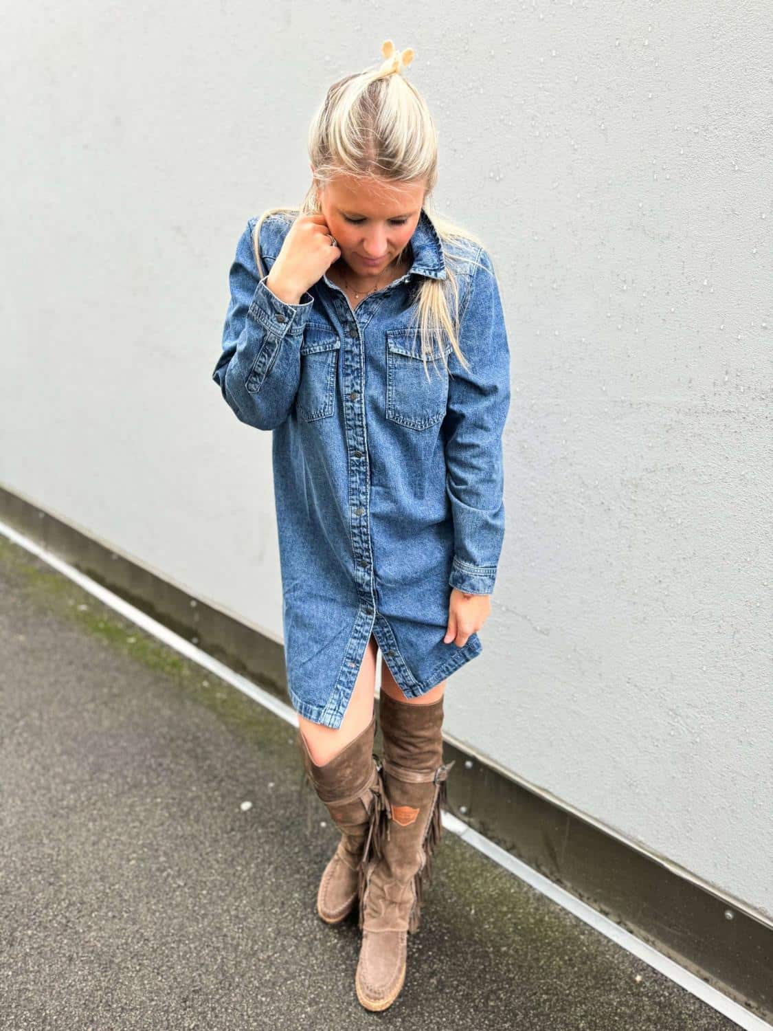 Kjolen kan kneppes opp og brukes som en lang denim – skjorte.