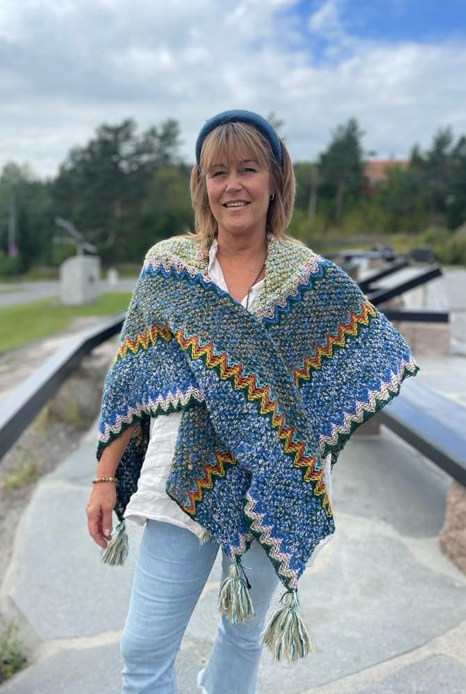 Lekker fargerik poncho/sjal med store dusker.