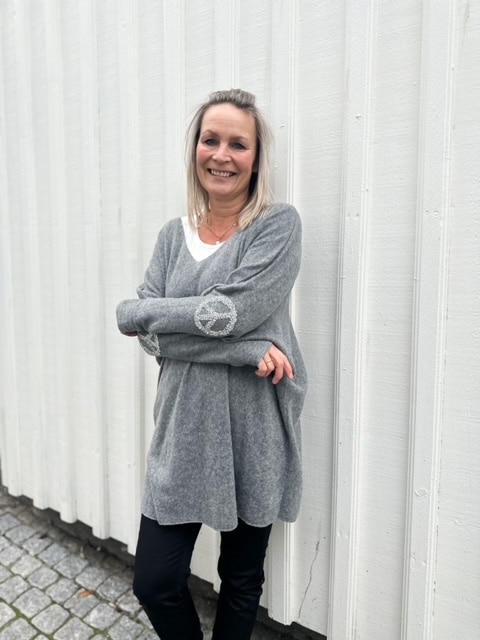 Den har en fin fasong, oversize og med peace tegn på albuene.