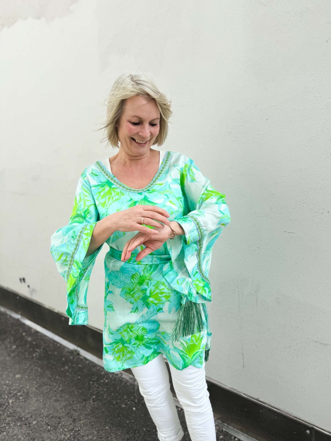 Denne kjolen kan også brukes som en tunika. Modellen på bildet er ca 168 cm høy og har på seg medium.