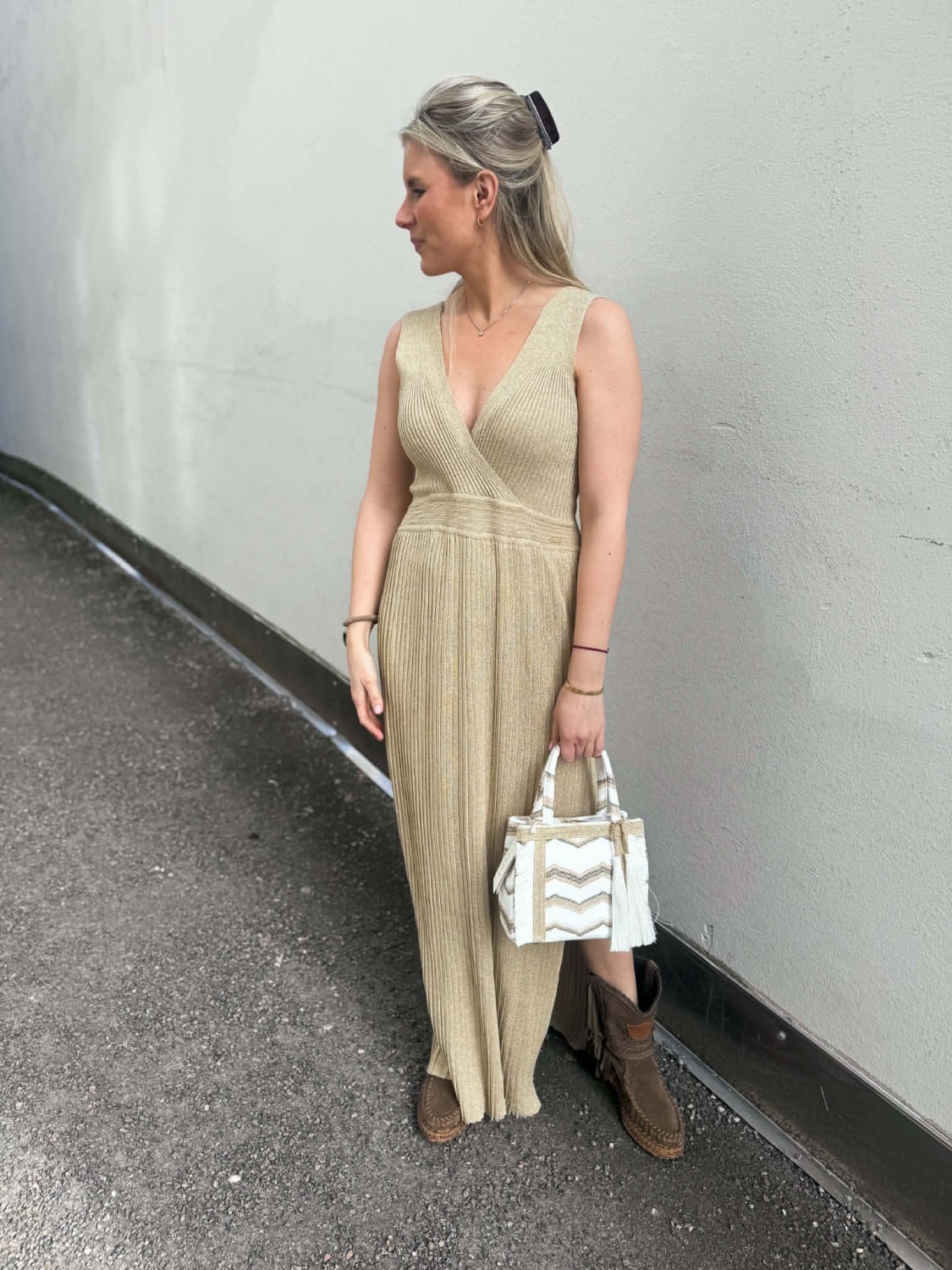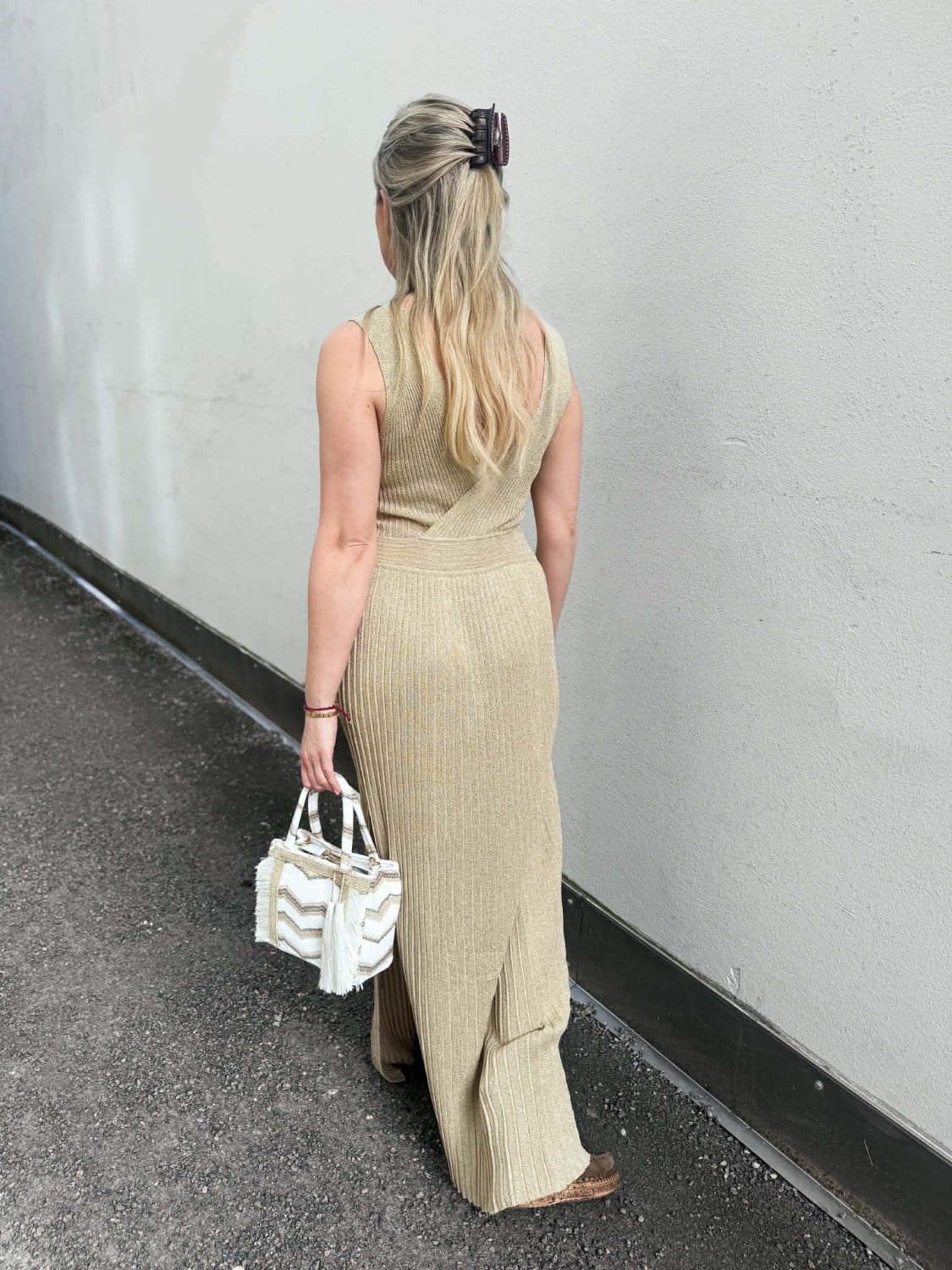 Denne kjolen er bare så elegant og vakker. Kvaliteten er i en strikket – look med lurex glitter i gull.