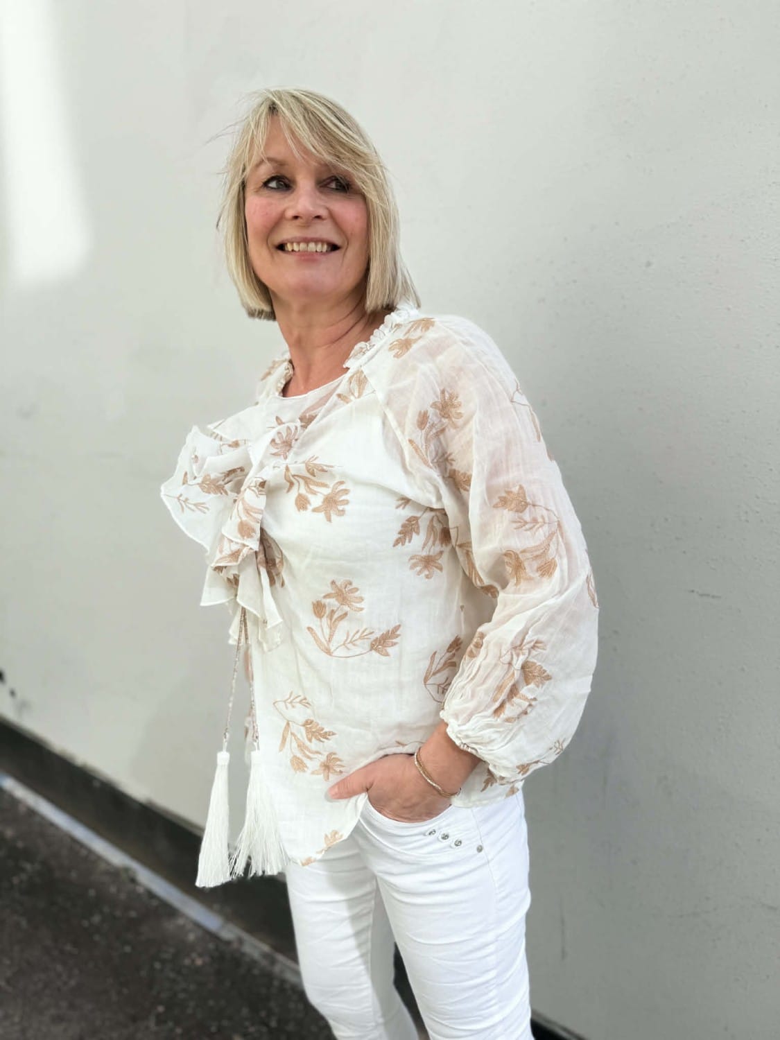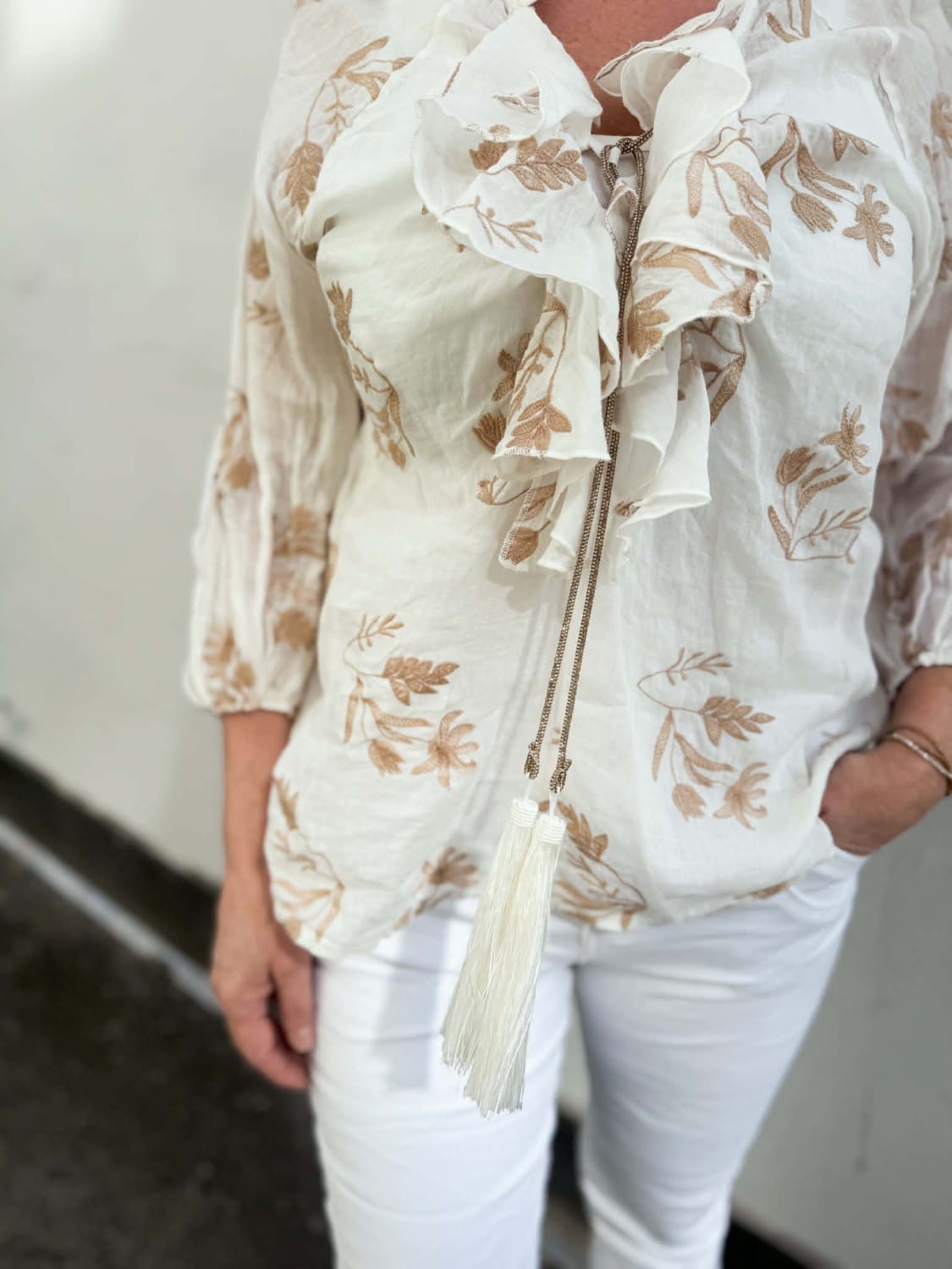 Nydelig bluse med lekre detaljer i 100% silke. Det følger med et glitre bånd i halsen som ser ut som et halskjedet.